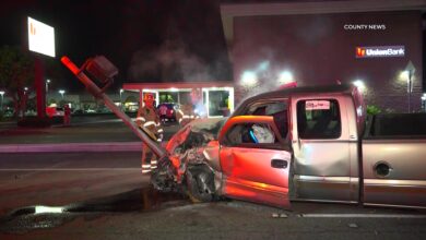 Tustin: Traffic Signal Pole Embedded In Truck After Crash